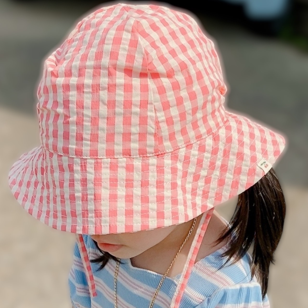 ピンク色のギンガムチェックがキュートなサンハットです。