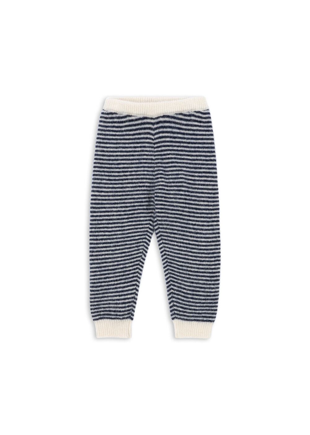 ネイビーブルーのボーダーのウール混ニットパンツ。