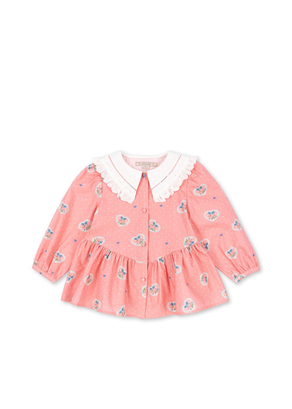 ピンク色に花柄、ハート、リボン、ドット。可愛いがぎゅっと詰まったブラウスです。