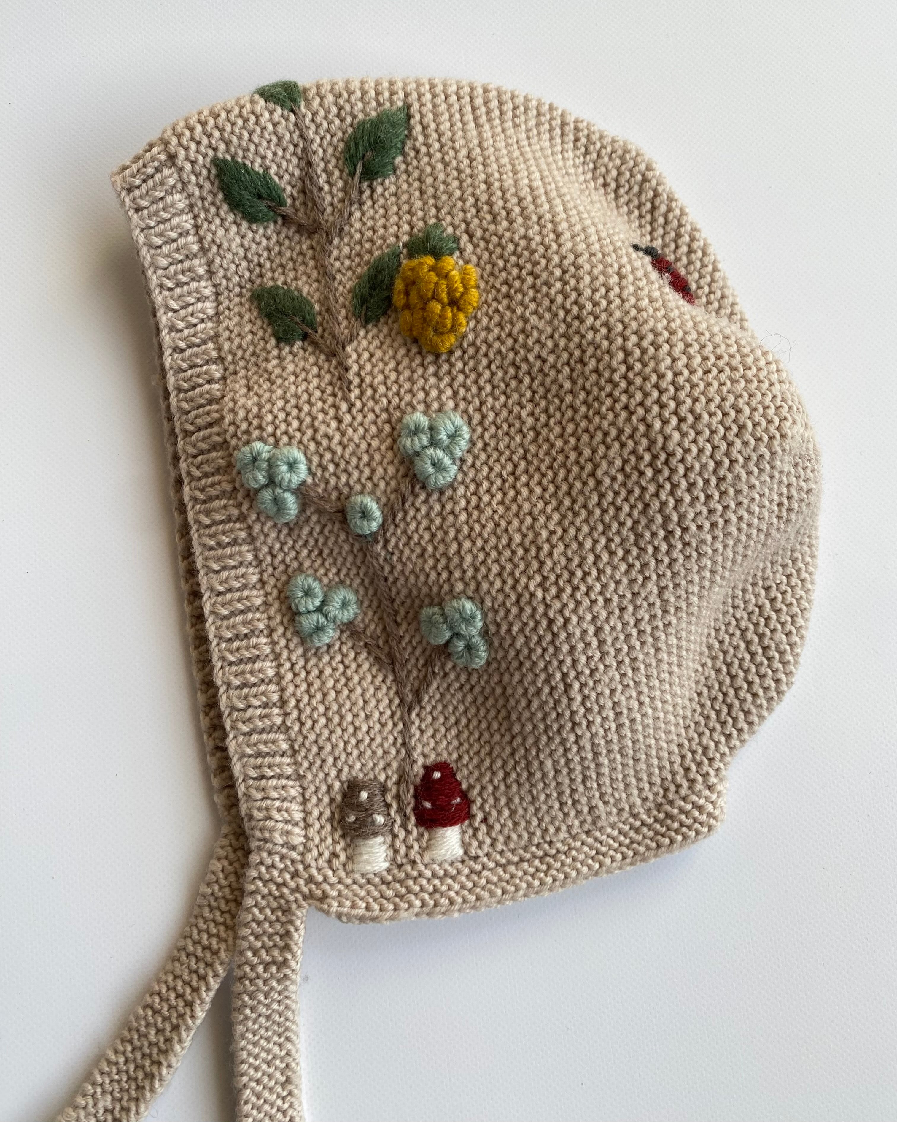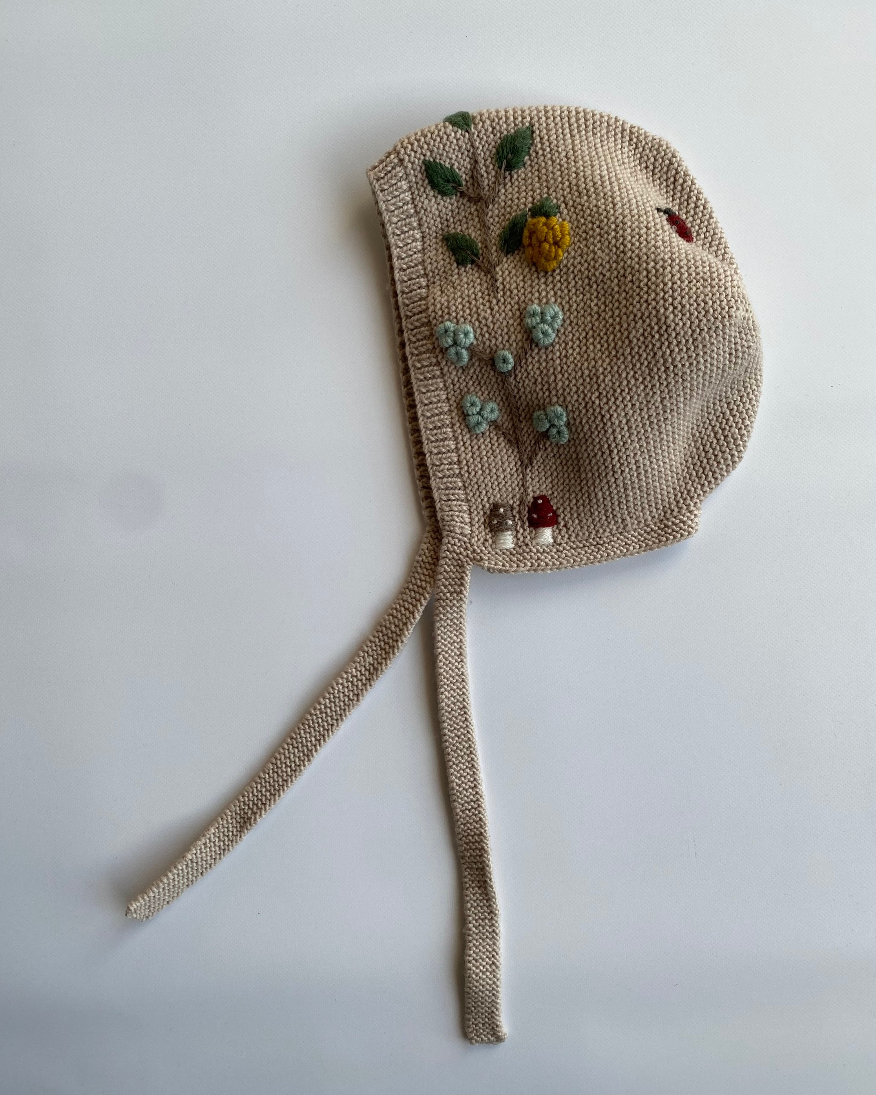 手刺繍が施された可愛いボンネットです。
