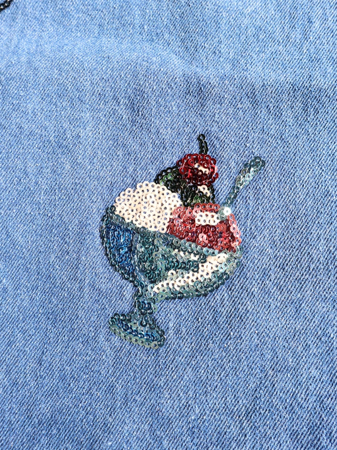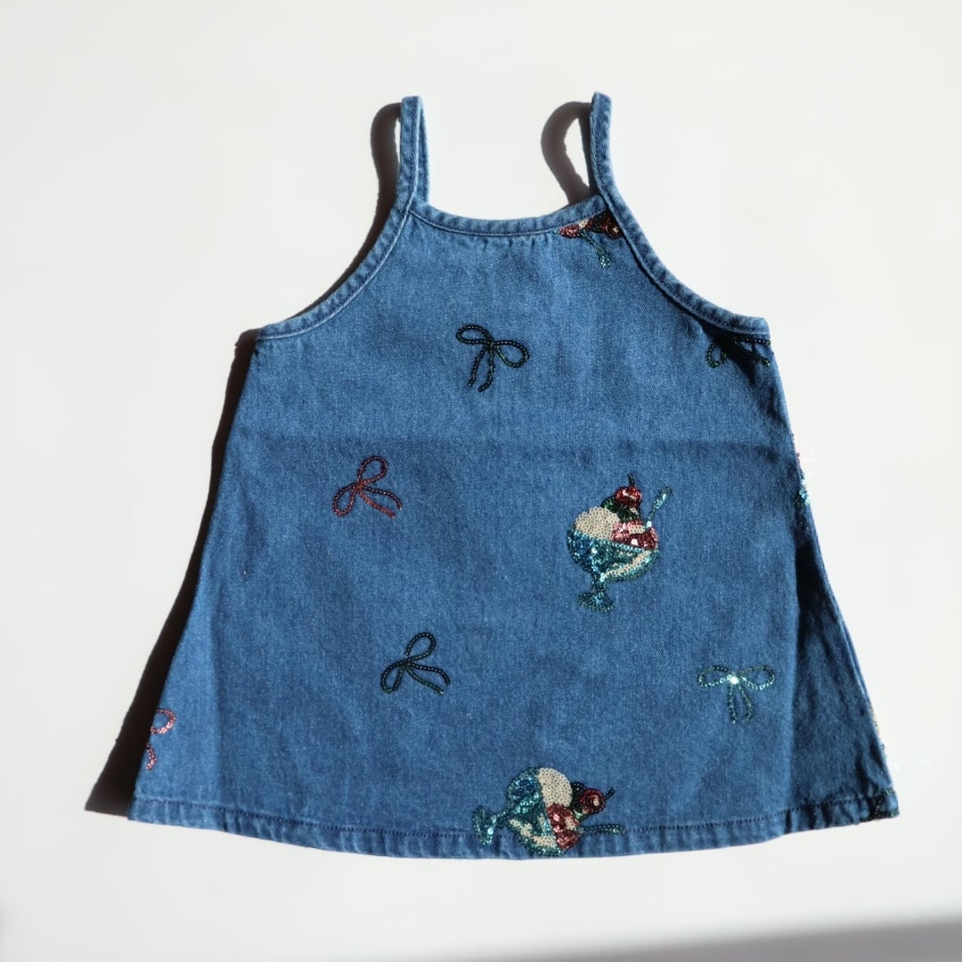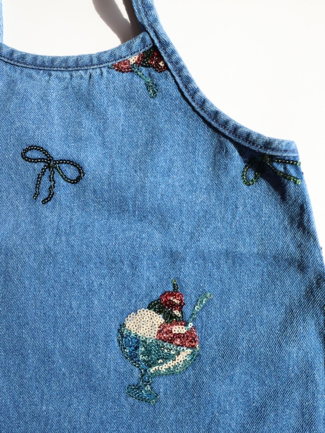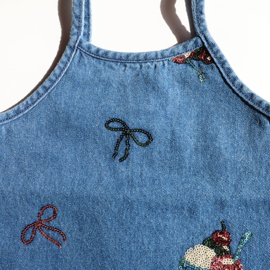 アイスクリームの刺繍がスパンコールでキラキラなデニムストラップドレス。