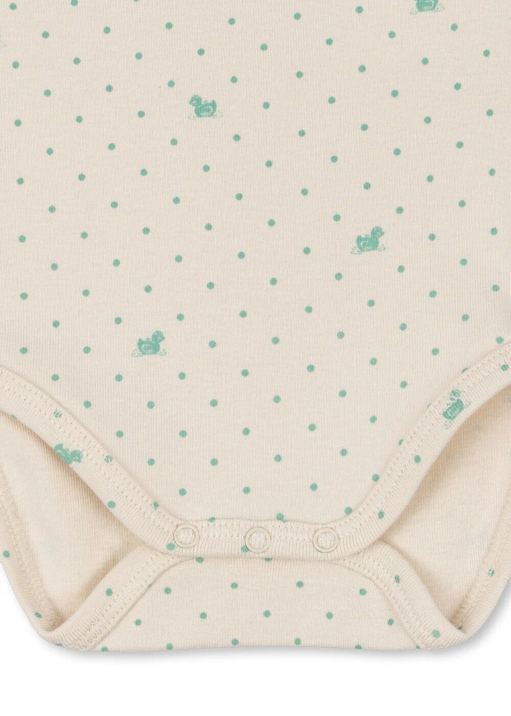 ドットと小さなひよこのイラストが控えめだけど愛おしい可愛さのロンパース。
